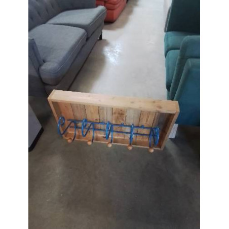 PORTE MANTEAU MURAL COFFRAGE BOIS CLAIR 5 PATÈRES MÉTAL BLEU BOULES BOIS