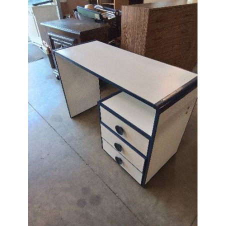 BUREAU RECTANGULAIRE BOIS BLANC LISERÉ BLEU 3 TIROIRS 1 NICHE