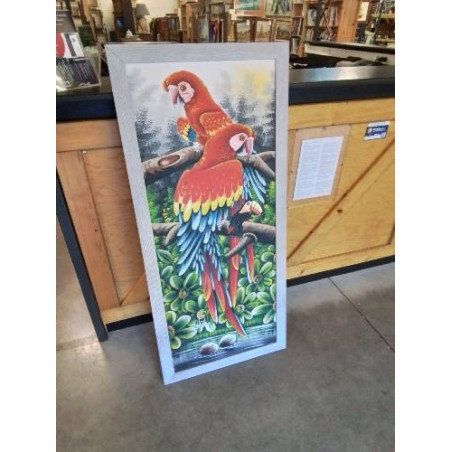 • TABLEAU AUX PERROQUETS ET AU TOUCAN CADRE BOIS GRIS 132X60CM