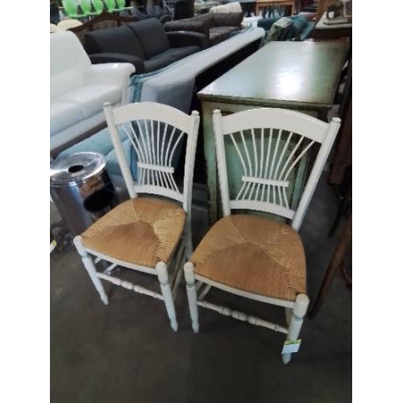 • PAIRE DE CHAISES BOIS BLANC DOSSIER LYRE ASSISE PAILLÉ