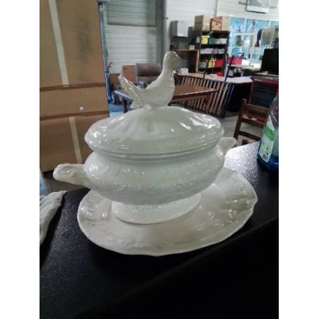 • SOUPIÈRE ET SON DORMANT AU PIGEON CÉRAMIQUE BLANC