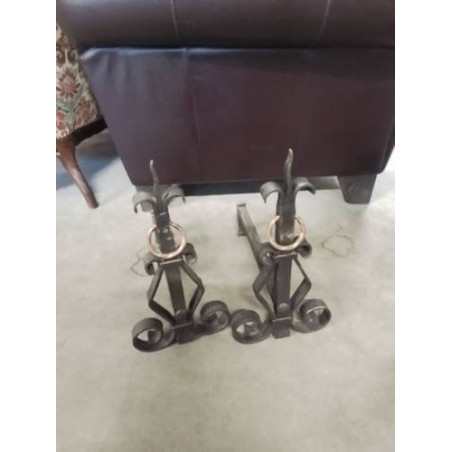 PAIRE DE CHENETS FER FORGÉ ANSE CUIVRE