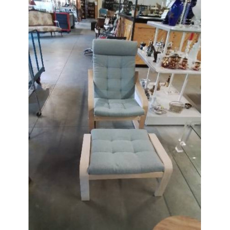 FAUTEUIL ET SON REPOSE PIEDS BOIS CLAIR ET TISSU GRIS