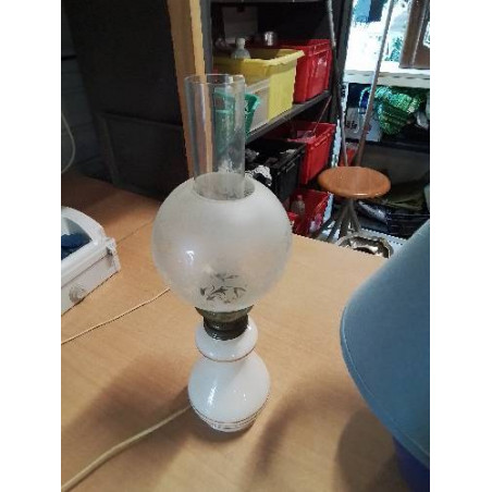 LAMPE A PETROLE ÉLECTRIFIÉE CÉRAMIQUE ECRU LISERÉ DORÉ BOULE VERRE