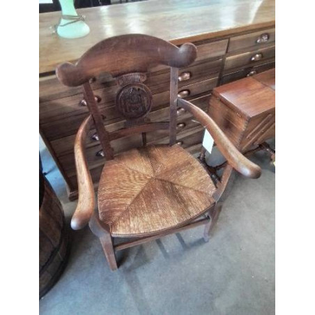 FAUTEUIL DE CHEMINÉE BOIS PAILLÉ DOSSIER SCULPTÉ AUX FLEURS XIXE