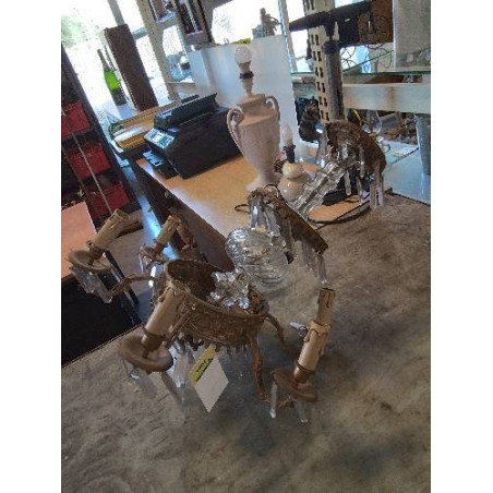 • LUSTRE LAITON  ET VERRE A PENDELOQUES 6 FEUX FIN XIXE