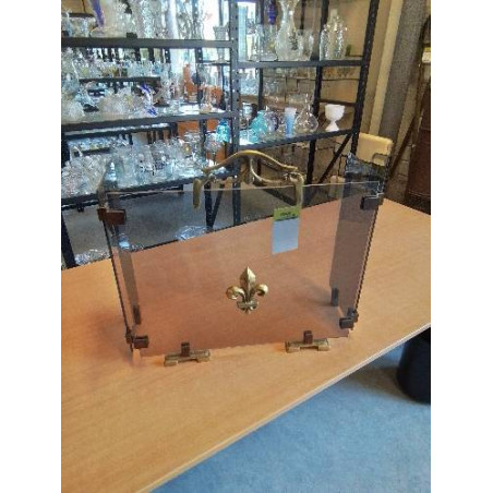 PARE FEU DE CHEMINÉE 3 VANTAUX VERRE TEINTÉ ET MÉTAL DORÉ A LA FLEUR DE LYS