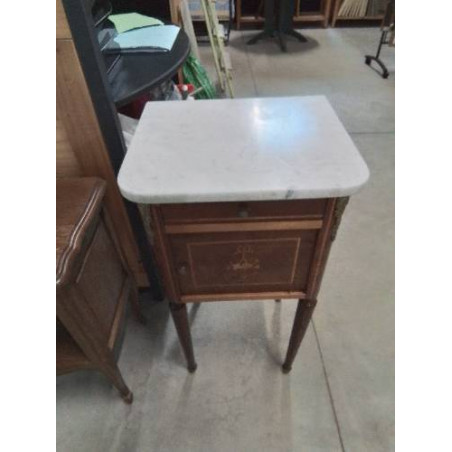 CHEVET BOIS MARQUETÉ GARNITURES BRONZE 1 TIROIR 1 POTTE DESSUS MARBRE BLANC STYLE LOUIS XVI