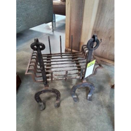 PAIRE DE CHENETS ET SON BERCEAU DE CHEMINÉE FER FORGÉ