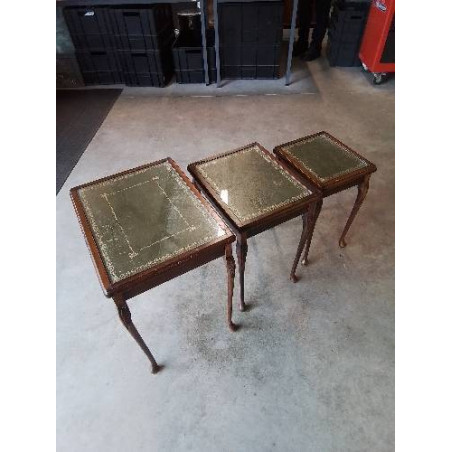 3 TABLES BASSES GIGOGNES ANGLAISE PIÈTEMENT BOIS DESSUS CUIR VERT LISERÉ DORÉ ET PLATEAUX VERRE