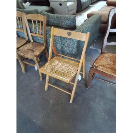 • CHAISE PLIANTE BOIS CLAIR ASSISE CANNÉE DOSSIER AJOURÉ AU COEUR