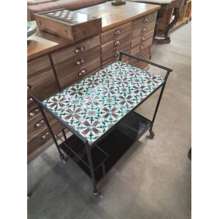 • DESSERTE A ROULETTES PIÈTEMENT FER FORGÉ PLATEAU CARRELÉ ANNÉES 50
