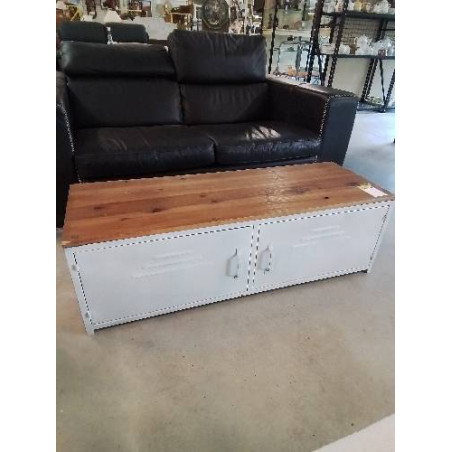 MEUBLE TV BAS MÉTAL ECRU 2 PORTES DESSUS PLATEAU BOIS STYLE INDUSTRIEL